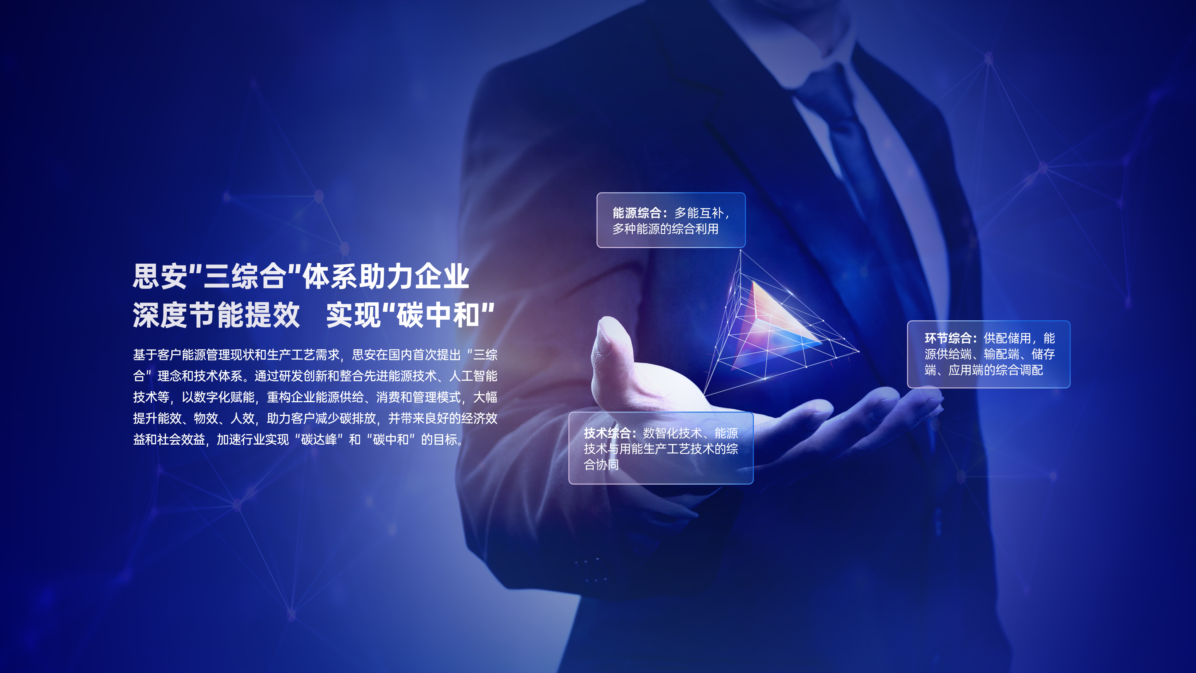 随着“双碳”战略目标的提出,能源消费面临结构变革,用户侧综合能源迎来发展机遇。公司从能源消费的现状和需求出发,针对用能企业的痛点提供整体解决方案。公司率先提出“三综合”顶层技术体系,即多能互补,多种能源的综合利用;供配储用,从供给端、输配端、储存端、应用端的综合调配;数智化技术、能源技术与用能生产工艺技术的综合协同,引领用户侧综合能源服务发展的方向。